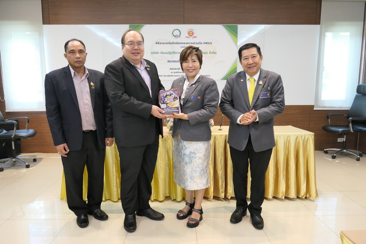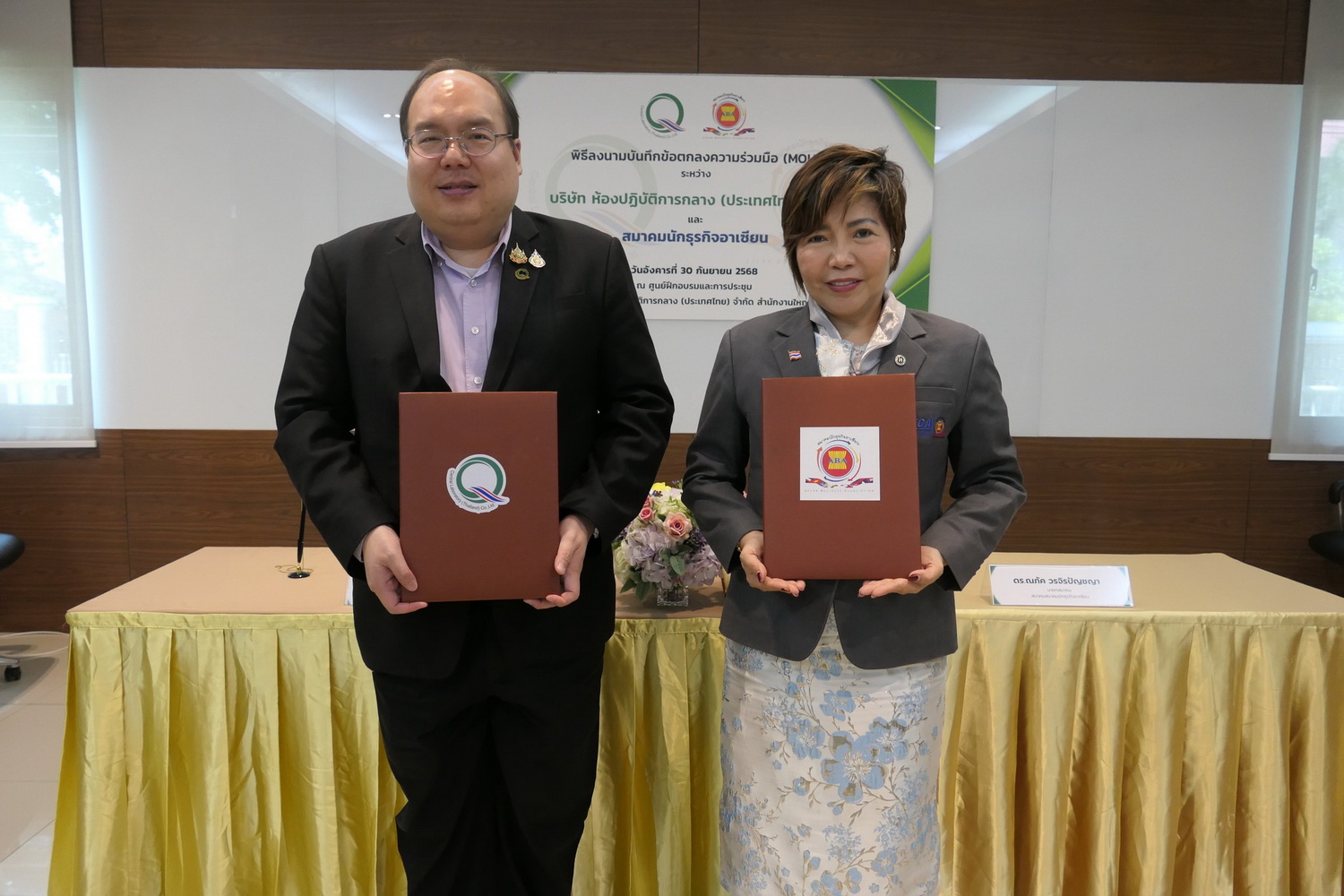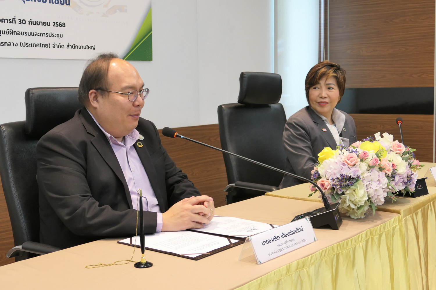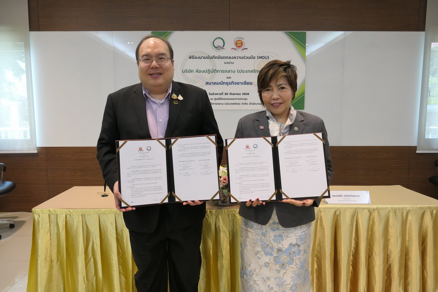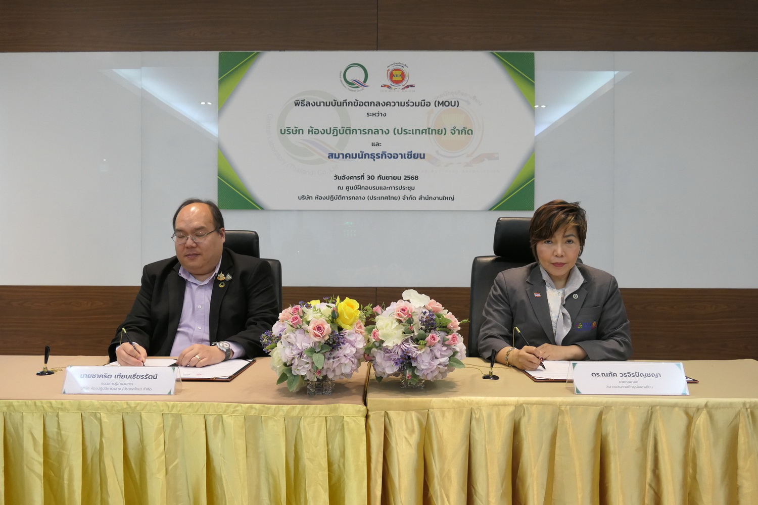 นายชาคริต เทียบเธียรรัตน์ กรรมการผู้อำนวยการ บริษัท ห้องปฏิบัติการกลาง (ประเทศไทย) จำกัด ลงนามในบันทึกข้อตกลงความร่วมมือ (MOU) ร่วมกับ สมาคมนักธุรกิจอาเซียน โดย ดร.ณภัค วรจิรปัญชญา นายกสมาคม สร้างความร่วมมือในการพัฒนาและผลักดันมาตรฐานการทดสอบทางห้องปฏิบัติการเพื่อเป็นเครื่องมือของผู้ประกอบการนักธุรกิจในเวทีอาเซียนในการขับเคลื่อนคุณภาพของสินค้าให้มีมาตรฐานระดับสากลแบบครบวงจร ทั้งต้นน้ำ กลางน้ำ และปลายน้ำ โดยมีผู้บริหารจากทั้ง 2 หน่วยงานร่วมเป็นสักขีพยาน เมื่อวันที่ 30 กันยายน 2568 ณ ห้องประชุม 4 อาคารศูนย์ฝึกอบรมและการประชุม บริษัท ห้องปฏิบัติการกลาง (ประเทศไทย) จำกัด สำนักงานใหญ่