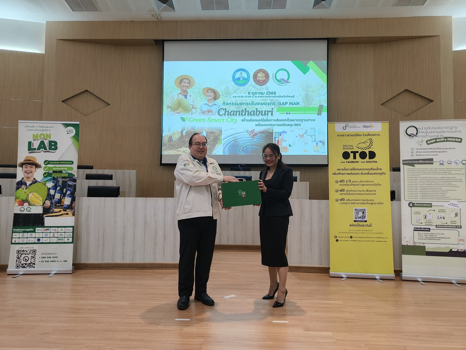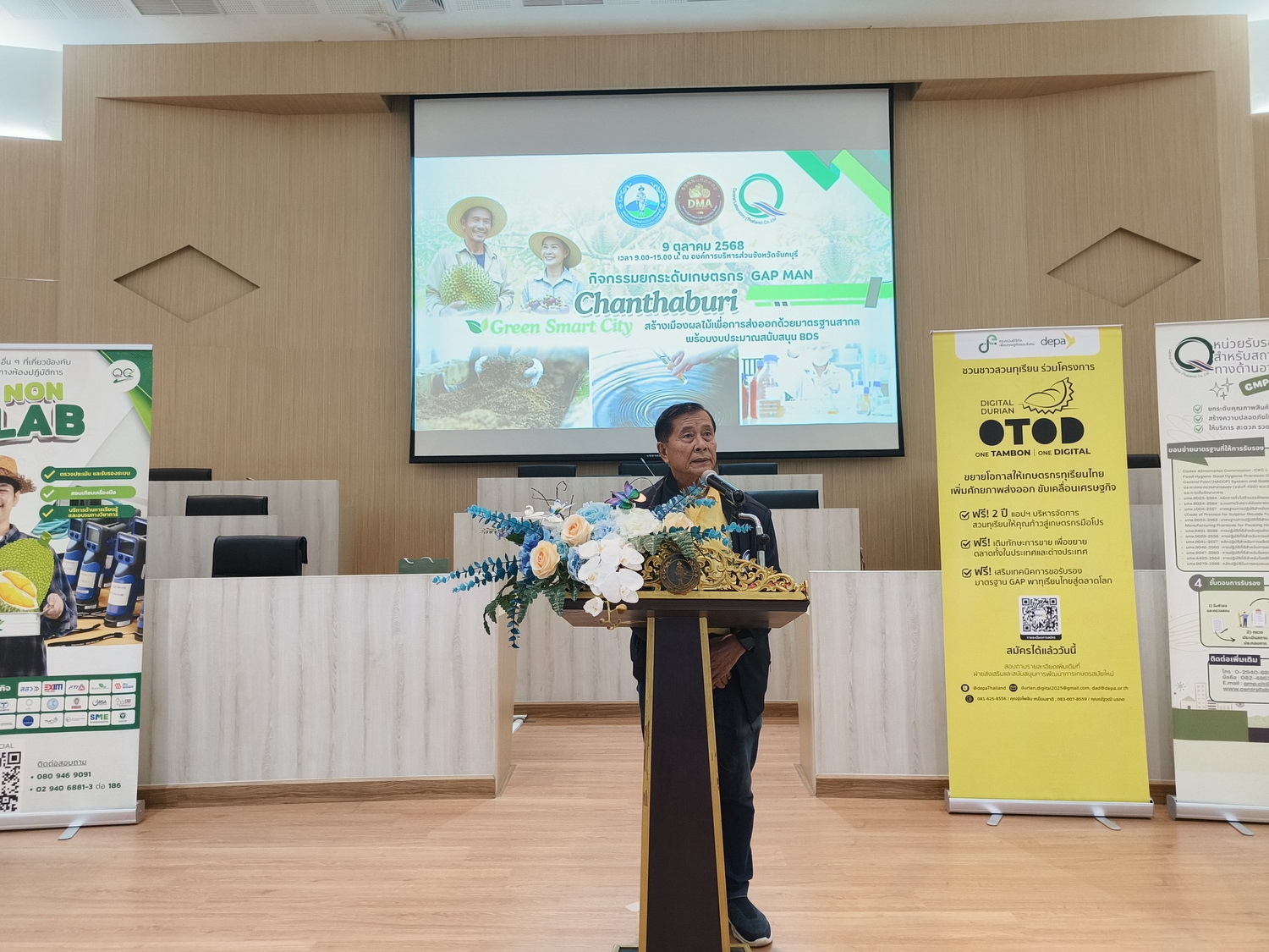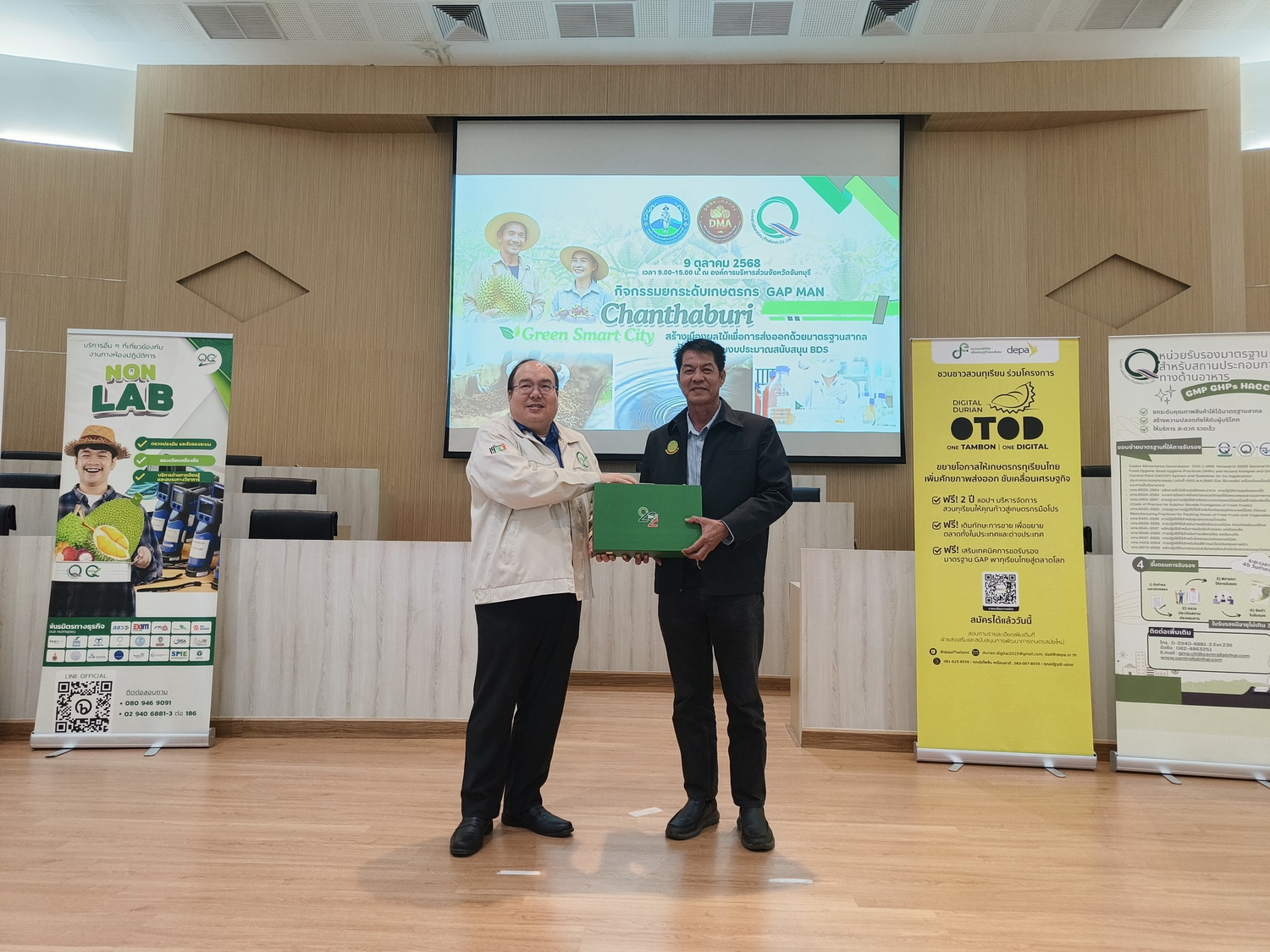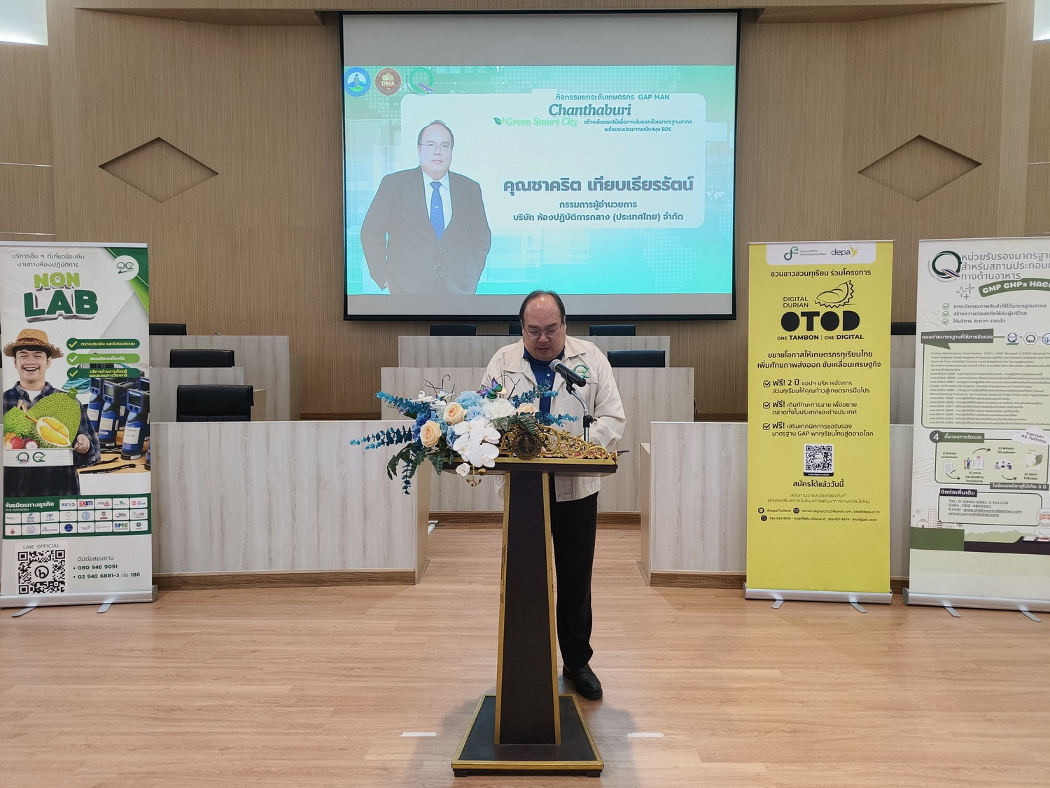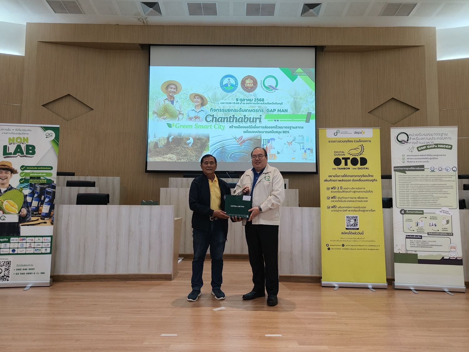 เมื่อวันที่ 9 ตุลาคม 2568 ณ ห้องประชุมบุษราคัม องค์การบริหารส่วนจังหวัดจันทบุรี บริษัท ห้องปฏิบัติการกลาง (ประเทศไทย) จำกัด นำโดย นายชาคริต เทียบเธียรรัตน์ กรรมการผู้อำนวยการ ร่วมกับองค์การบริหารส่วนจังหวัดจันทบุรี สมาคมผู้ประกอบการส่งออกทุเรียนมังคุด สำนักงานพัฒนาที่ดินจันทบุรี ศูนย์ให้บริการ SME ครบวงจร (OSS) จันทบุรี และสำนักงานส่งเสริมเศรษฐกิจดิจิทัล (DEPA) ได้ร่วมกันจัดกิจกรรม กิจกรรมยกระดับเกษตรกร GAP MAN Chanthaburi Green Smart City สร้างเมืองผลไม้เพื่อการส่งออกด้วยมาตรฐานสากล พร้อมงบประมาณสนับสนุน BDS เพื่อยกระดับมาตรฐานการผลิตทุเรียนไทยให้ได้คุณภาพตามหลักสากลในกลุ่มเกษตรกรและผู้ประกอบการในจังหวัดจันทบุรี มีขั้นตอนที่โปร่งใส ตรวจสอบย้อนกลับได้ และสร้างความเชื่อมั่นให้กับผู้บริโภคทั้งในและต่างประเทศ