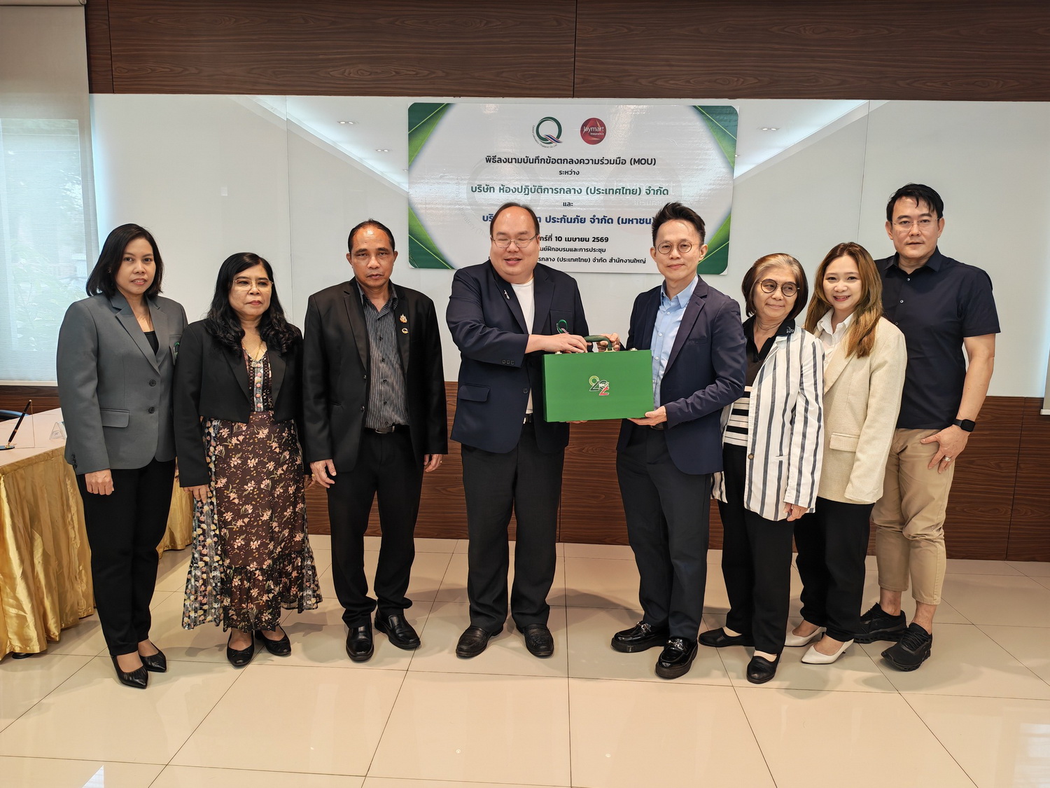 นายชาคริต เทียบเธียรรัตน์ กรรมการผู้อำนวยการ บริษัท ห้องปฏิบัติการกลาง (ประเทศไทย) จำกัด ลงนามในบันทึกข้อตกลงความร่วมมือ (MOU) ร่วมกับ บริษัท เจมาร์ท ประกันภัย จำกัด (มหาชน) โดย ดร.ฉัตรชัย ธนาฤดี ประธานเจ้าหน้าที่บริหารบริษัท สำหรับสร้างความเชื่อมั่นในการดูแลเครื่องมือวิเคราะห์ทางวิทยาศาสตร์ที่ใช้ในกระบวนการทดสอบทางห้องปฏิบัติการ เมื่อวันที่ 10 เมษายน 2569 ณ ห้องประชุม 4 อาคารศูนย์ฝึกอบรมและการประชุม บริษัท ห้องปฏิบัติการกลาง (ประเทศไทย) จำกัด สำนักงานใหญ่
