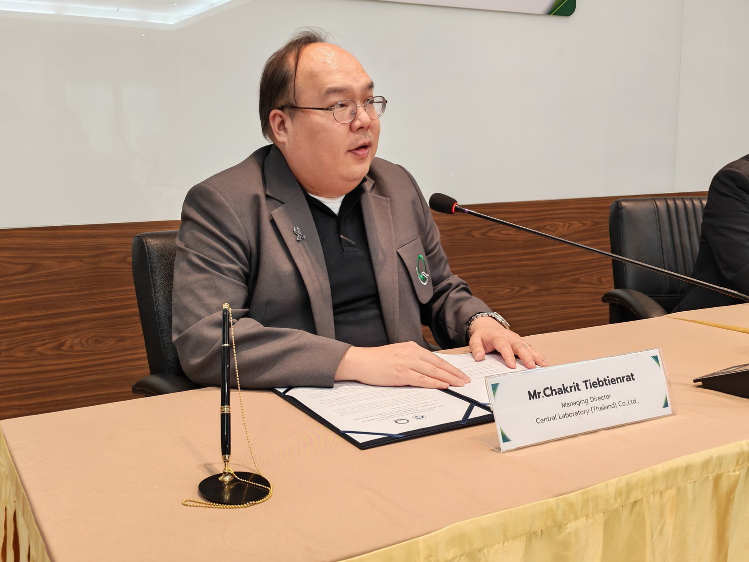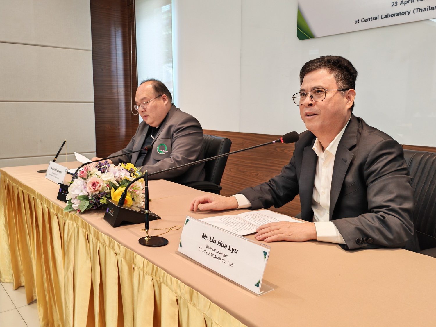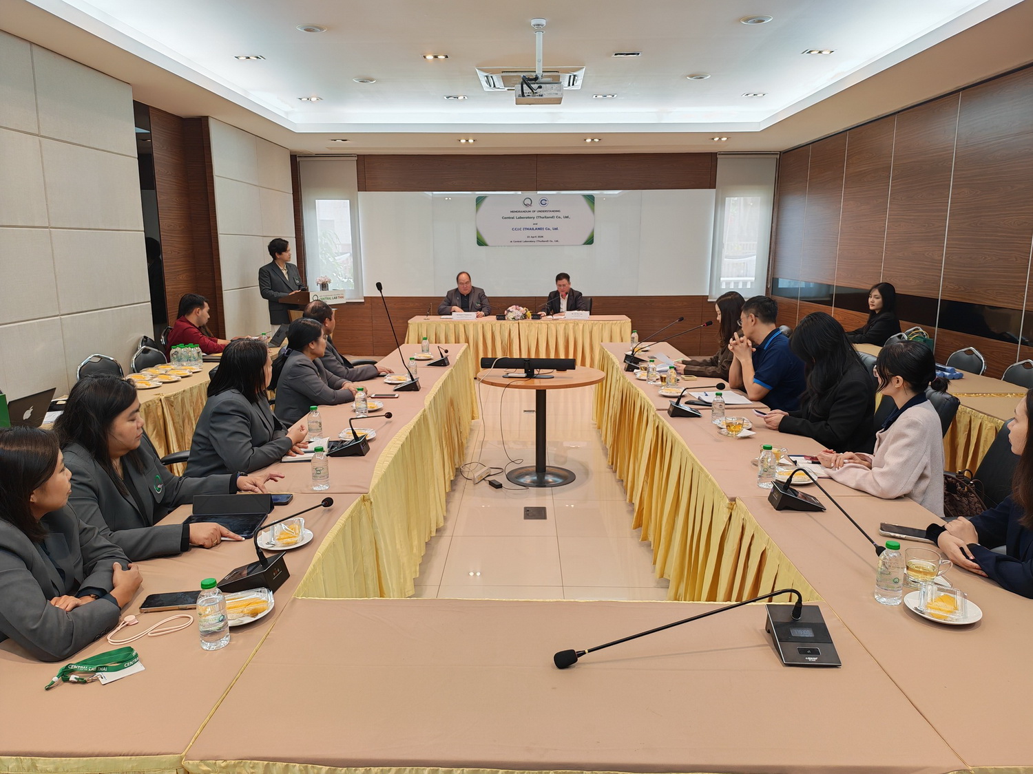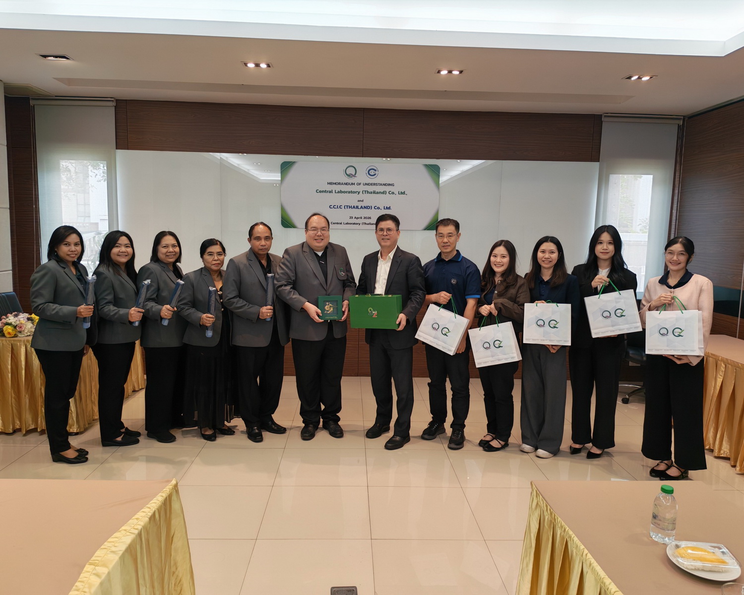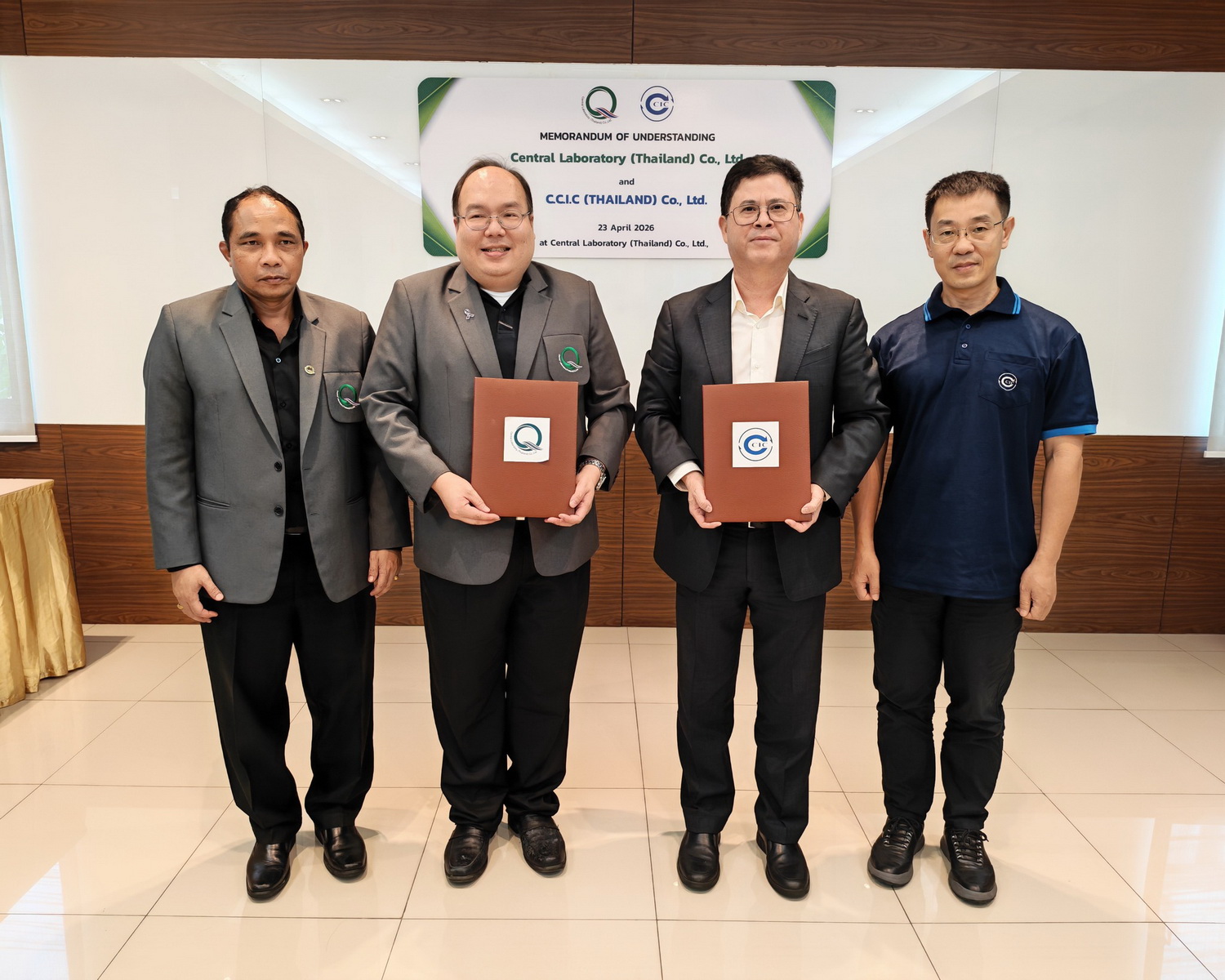 นายชาคริต เทียบเธียรรัตน์ กรรมการผู้อำนวยการ บริษัท ห้องปฏิบัติการกลาง (ประเทศไทย) จำกัด ลงนามบันทึกข้อตกลงความร่วมมือกับ C.C.I.C (Thailand) Co., Ltd. โดย Mr. Liu Hua Lyu General Manager โดยมีผู้บริหารจากทั้ง 2 หน่วยงานร่วมเป็นสักขีพยาน ในการสร้างความร่วมมือพัฒนารายการทดสอบทางห้องปฏิบัติการระหว่าง 2 หน่วยงาน เพื่อเพิ่มขีดความสามารถในการส่งออกสินค้าของผู้ประกอบการระหว่าง 2 ประเทศ เมื่อวันที่ 23 เมษายน 2569 ณ ห้องประชุม 4 อาคารศูนย์ฝึกอบรมและการประชุม บริษัท ห้องปฏิบัติการกลาง (ประเทศไทย) จำกัด สำนักงานใหญ่