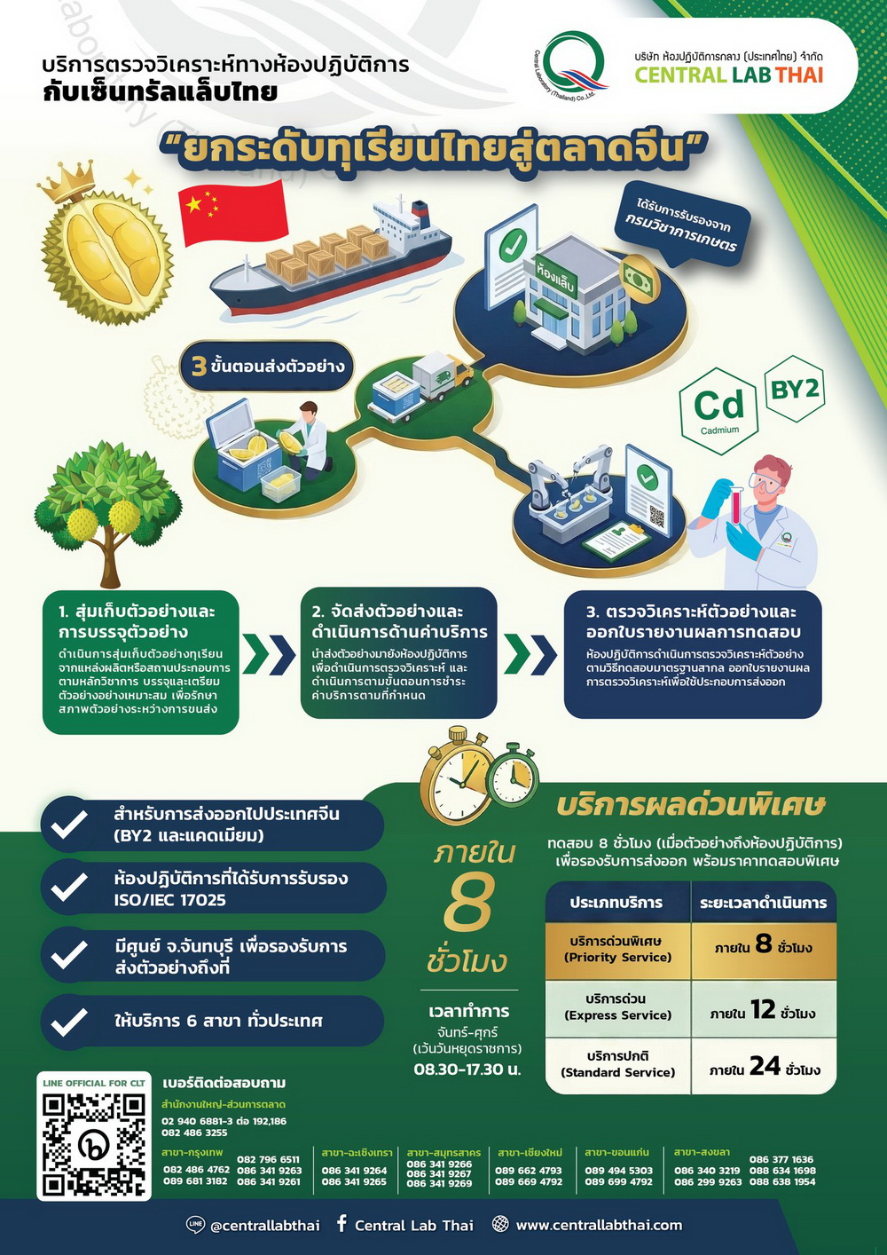 #เซ็นทรัลแล็บไทย #ทุเรียนส่งออกจีน #BY2 #แคดเมียม #ศูนย์จันทบุรี #หกสาขาทั่วไทย #ออกผลด่วน